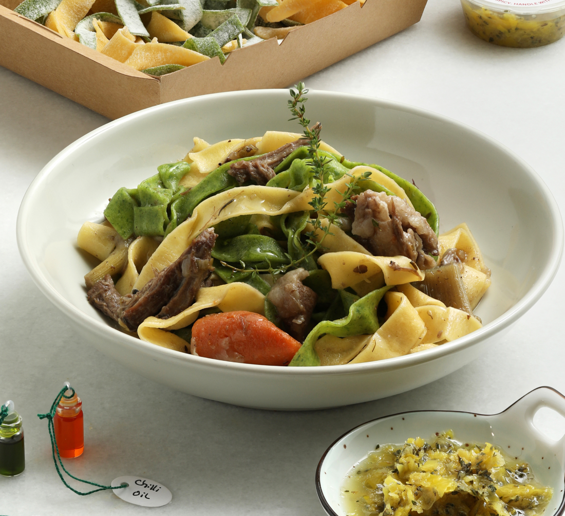 Includes: Fresh pasta of your selection, hearty chicken cacciatore sauce, handmade parmesan cheese, basil oil,...