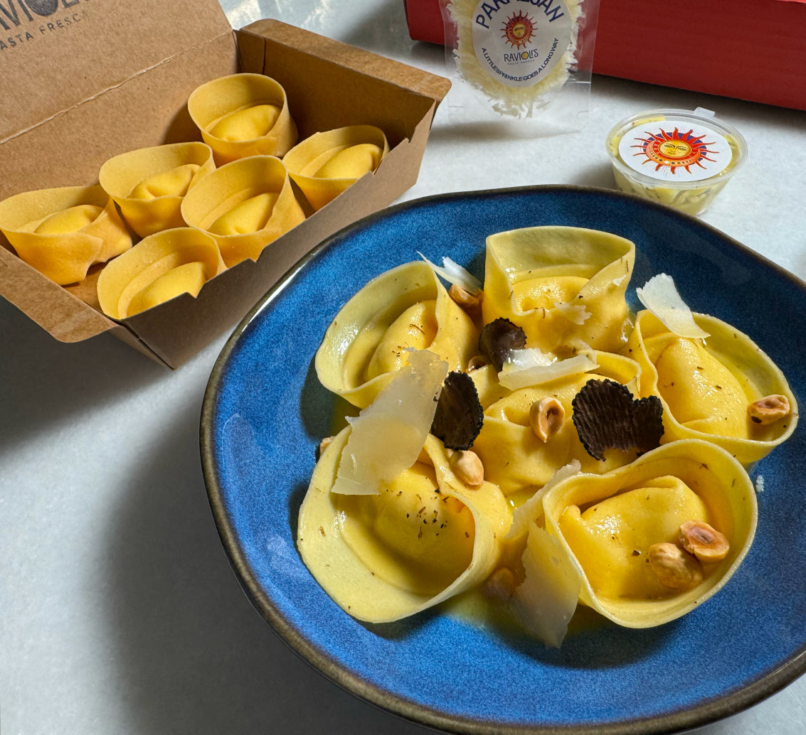 Includes: Handcrafted tortelloni, filled with the finest creamy burrata, and black truffle, paired with browned truffle butter and toasted hazelnuts.