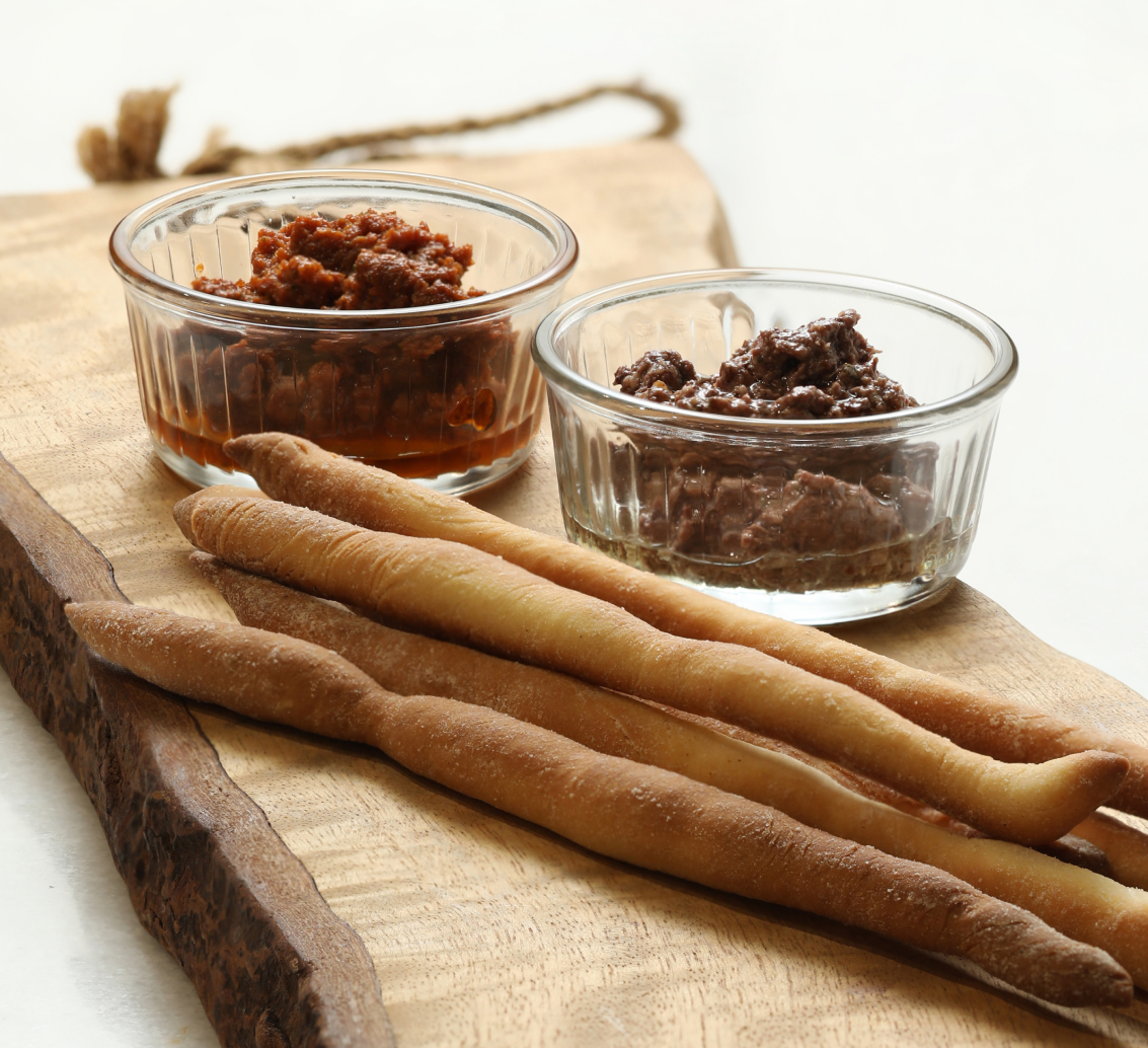 Classic Italian breadsticks, baked to golden perfection for the perfect crunch, with black olive tapenade and sundried tomato tapenade.