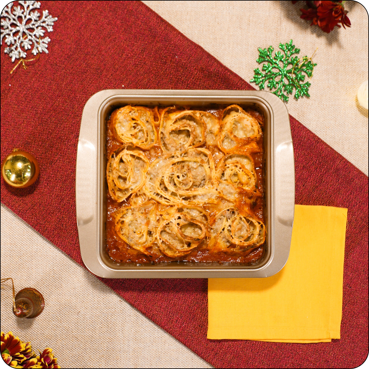 - • Silky béchamel layered through every spiral